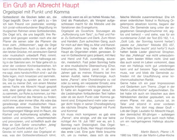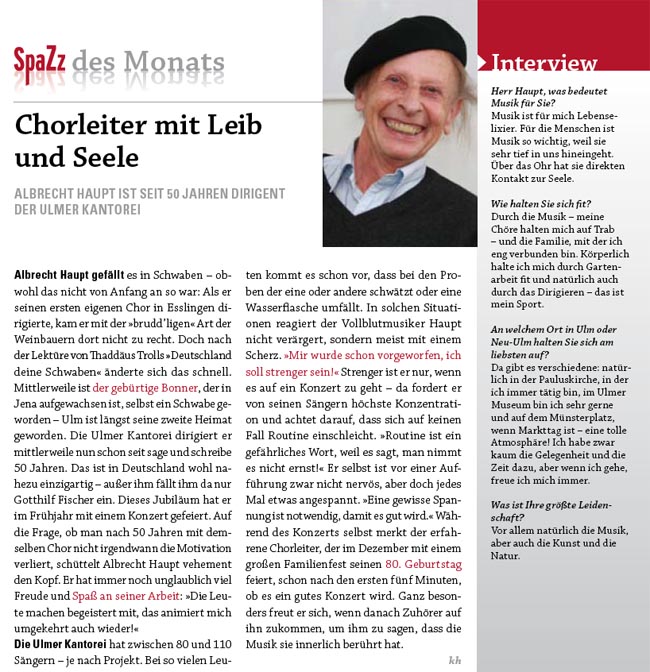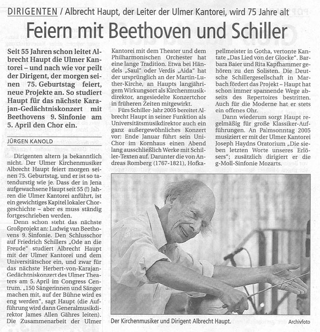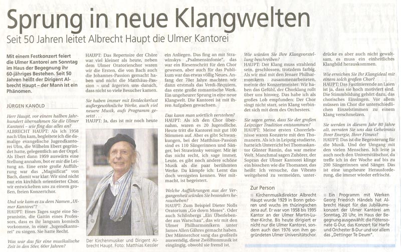 ist ein Vollblutmusiker. Aufgewachsen in Jena, studierte er zunächst in seiner Heimatstadt, danach an der Universität Leipzig Musikwissenschaft und Kunstgeschichte, später Orgel und Dirigat an der Leipziger Musikhochschule. In Stuttgart, Esslingen und Tübingen setzte er seine Studien fort. Er wurde 1958 Bezirkskantor an der Martin-Luther-Kirche in Ulm. Seit 1959 leitet er die Ulmer Kantorei. Albrecht Haupt wurde 1969 zum Kirchenmusikdirektor (KMD) ernannt. 1976 gründete er den Ulmer Universitätschor. 1991 verlieh ihm die Universität Ulm den Titel Universitätsmusikdirektor (UMD). Am 17.09.2010 wurde ihm das Verdienstkreuz am Bande des Verdienstordens der Bundesrepublik Deutschland verliehen. |