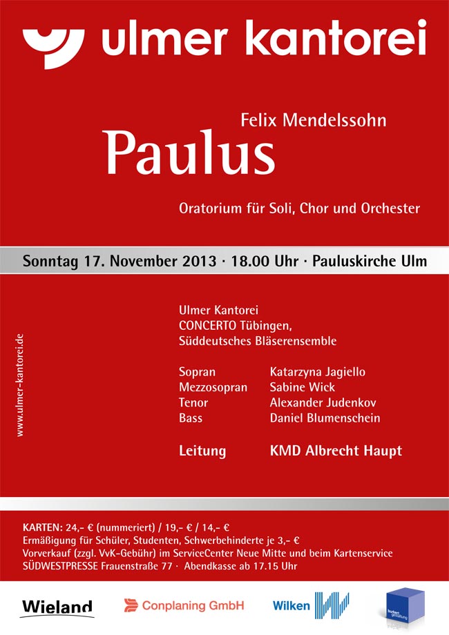 Felix Mendelssohn (1809 – 1847) schrieb das abendfüllende Oratorium „Paulus“ im Alter von 25 Jahren! Es wurde 1836 mit großer Besetzung in Düsseldorf uraufgeführt und ist seit dieser Zeit ein Standardwerk der romantischen Oratorienkunst, das die große Tradition von Händel und Haydn fortsetzt und ihr neue Dimensionen im Sinne frühromantischer Expressivität erschließt. Es ist zugleich auch ein Dokument der sympathischen Persönlichkeit Mendelssohns in seiner Auseinandersetzung mit dem Christen- und Judentum, dem er entstammt. Robert Schumann nennt es „ein Werk der reinsten Art, eines des Friedens und der Liebe“.